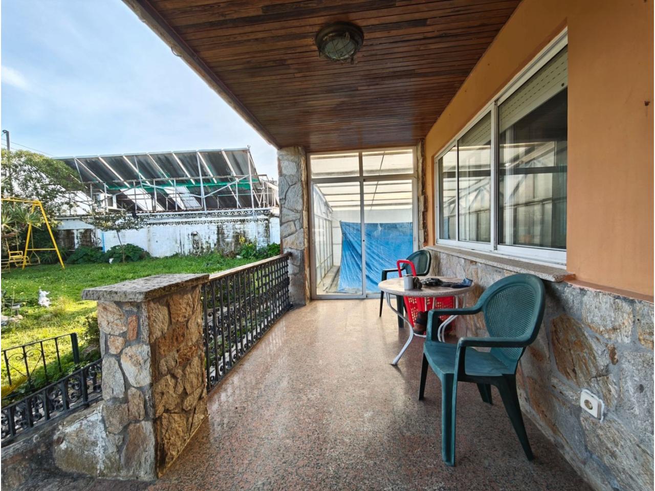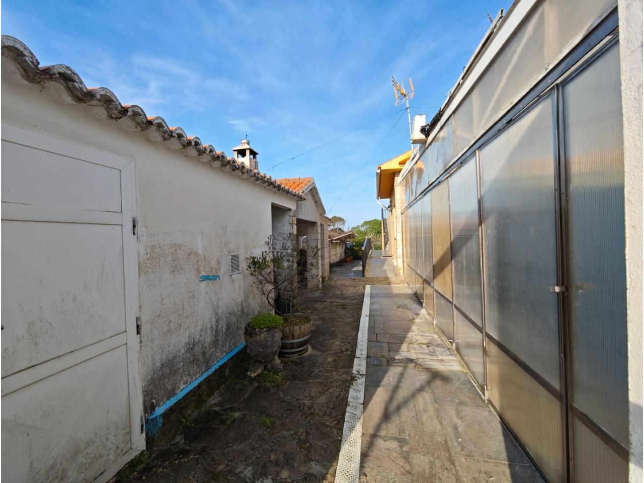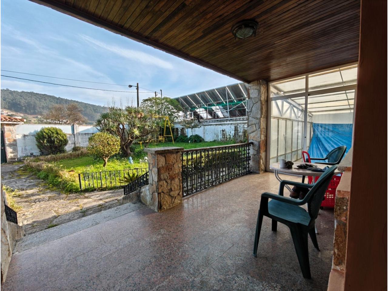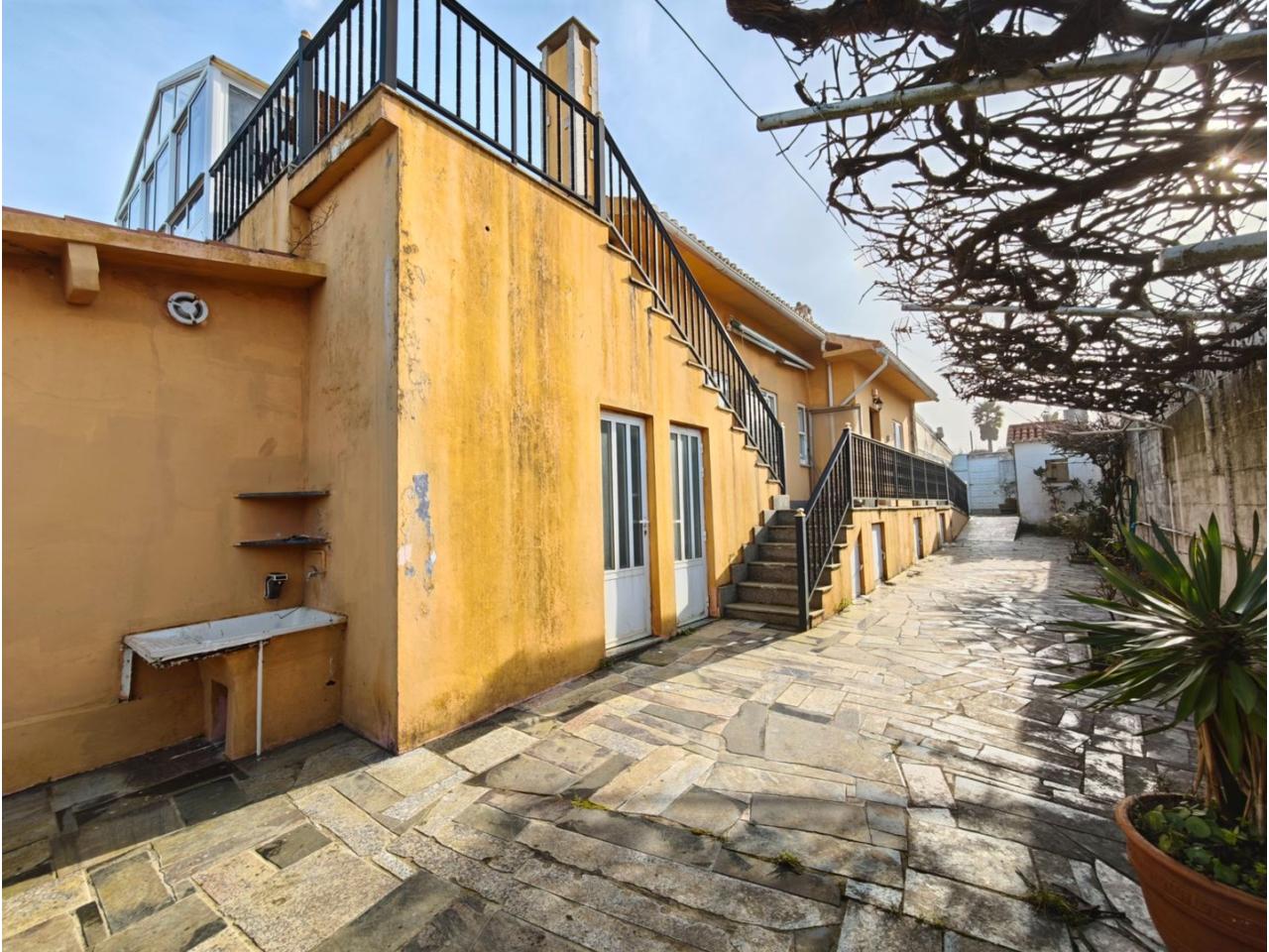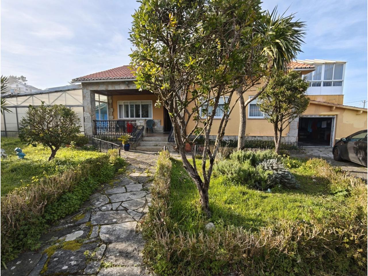Ref. 341. - Tan solo 400 m son los que separan este chalet de la playa de S. Jorge, una de las playas más exitosas para deportes acuáticos de la comarca. La casa se sitúa sobre dos parcelas haciendo un total de casi 2800 m² de jardín. La casa se distribuye de la siguiente manera: un poche nos da la bienvenida accediendo a la vivienda donde en planta baja tenemos un salón con chimenea, cocina, despensa, baño general con ducha, y tres dormitorios dobles de los cuales el principal en suite con baño con bañera al cual accedemos directamente a través del dormitorio o a través del pasillo. Toda la planta tiene doble ventanal. Saliendo, accedemos a través de unas escaleras a la planta alta, independiente, en donde tenemos una zona de terraza descubierta, zona de terraza cubierta y en el interior cocina americana con comedor, baño, y un buen dormitorio ó salón dependiendo de las necesidades (en la foto sería la zona de sofás) y una habitación interior, perfecta para un dormitorio auxiliar o almacenaje. En el exterior, disfrutaremos de nuestras tardes de verano de una mesa y bancos rodeados de árboles.. . y dos galpones para las gallinas, perros. etc. Por supuesto la piscina cubierta y climatizada a través de las placas térmicas instaladas en el jardín junto con las placas solares (las placas térmicas necesitan arreglos). La piscina cubierta se puede descubrir para disfrutar de los días estivales (necesita arreglos). Por último, el taller equipado con maquinaria en donde están las baterías de las placas. La finca está totalmente cerrada y tiene entrada por dos calles. Calefacción gasoil. Riego automático. MILCASAS Galicia.