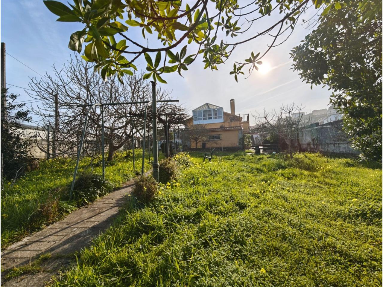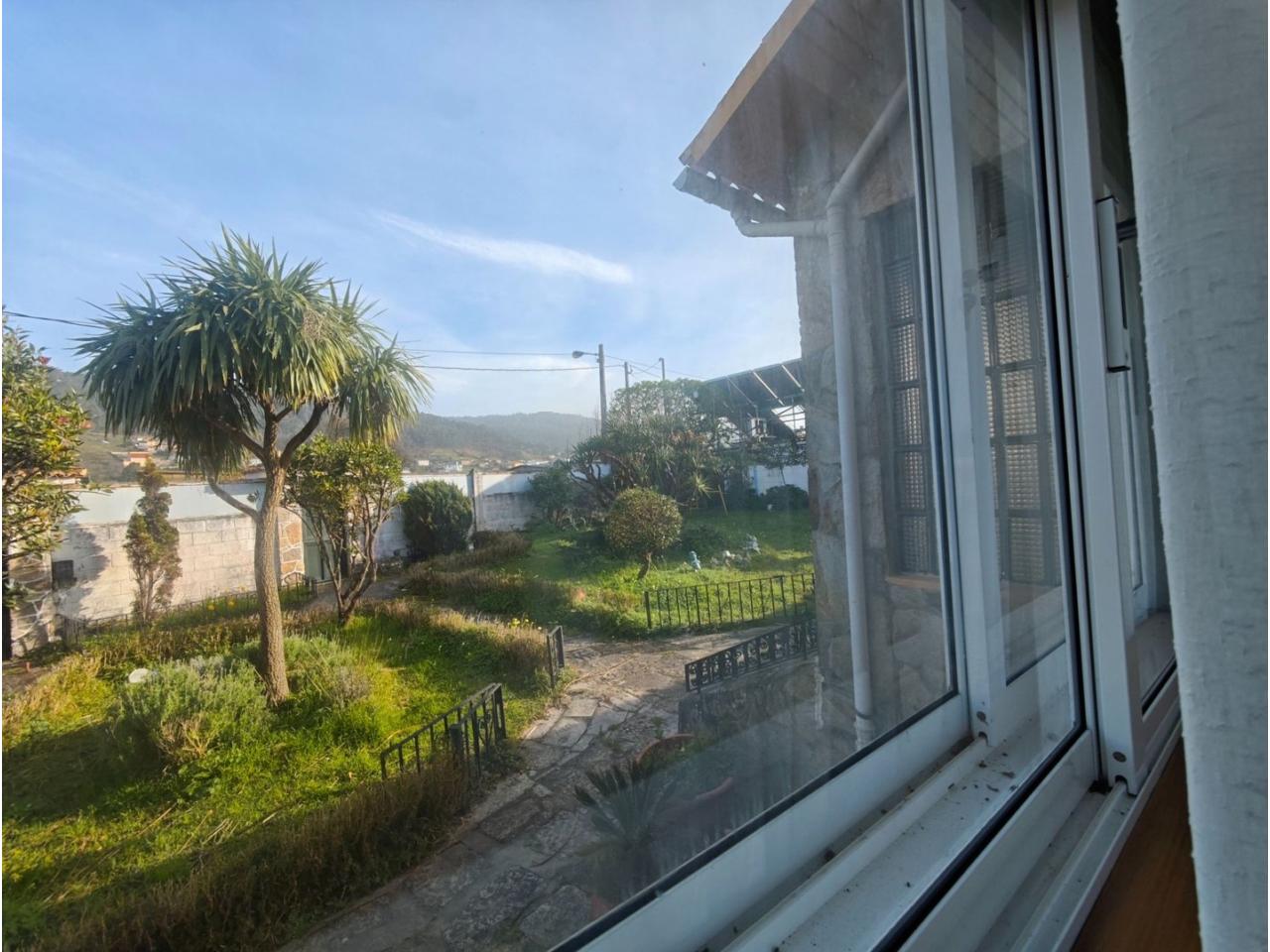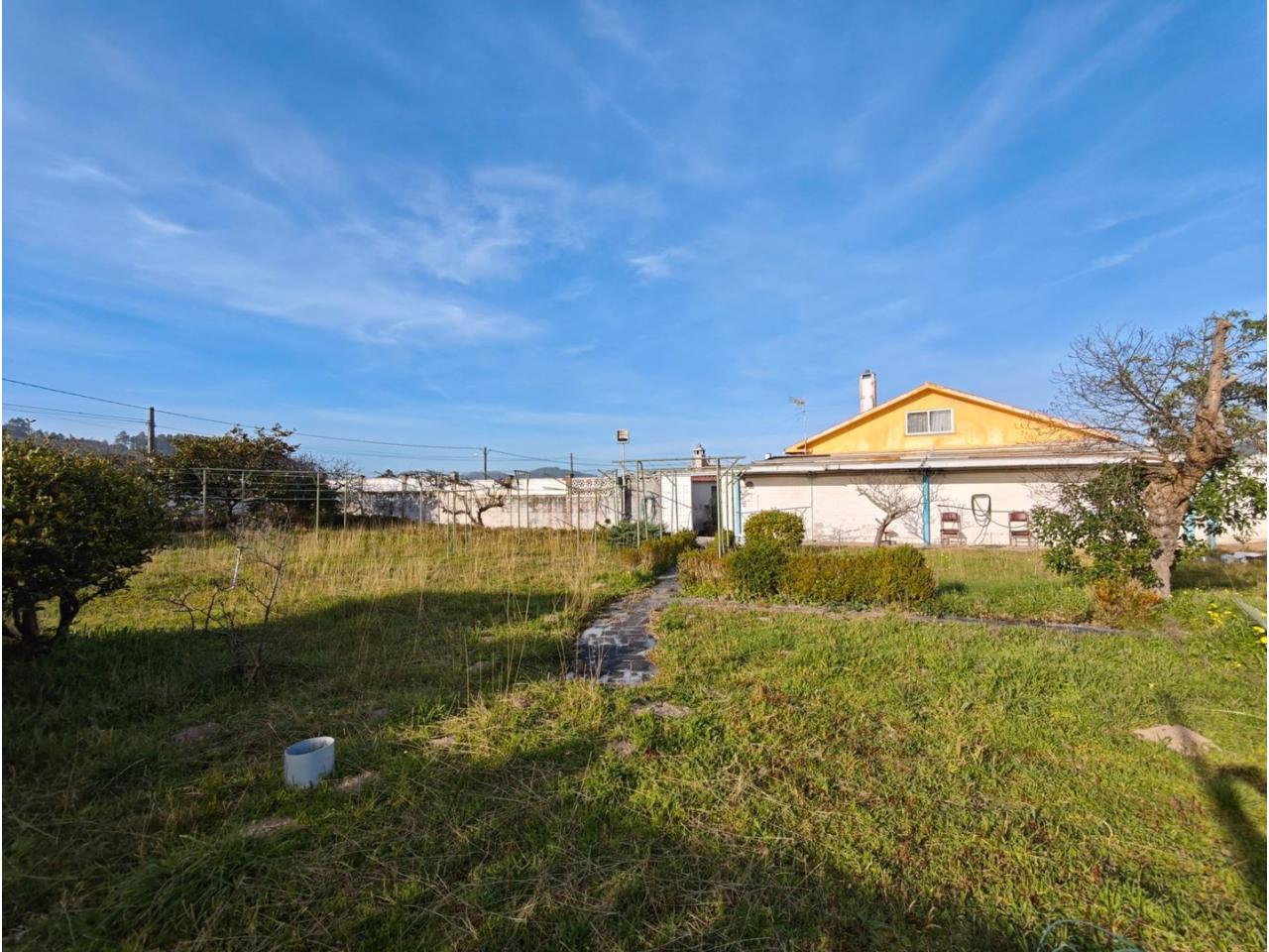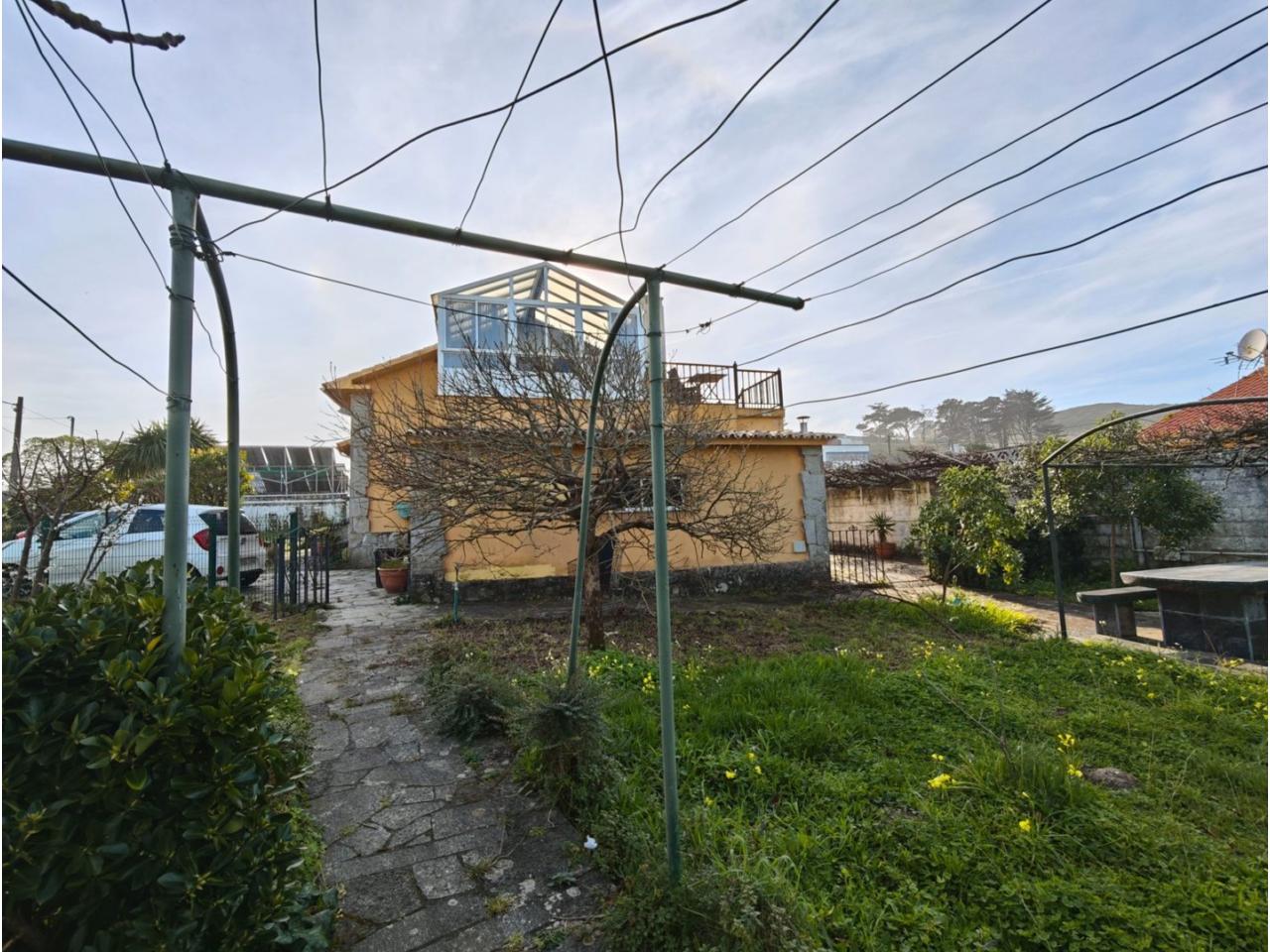 Ref. 341. - Tan solo 400 m son los que separan este chalet de la playa de S. Jorge, una de las playas más exitosas para deportes acuáticos de la comarca. La casa se sitúa sobre dos parcelas haciendo un total de casi 2800 m² de jardín. La casa se distribuye de la siguiente manera: un poche nos da la bienvenida accediendo a la vivienda donde en planta baja tenemos un salón con chimenea, cocina, despensa, baño general con ducha, y tres dormitorios dobles de los cuales el principal en suite con baño con bañera al cual accedemos directamente a través del dormitorio o a través del pasillo. Toda la planta tiene doble ventanal. Saliendo, accedemos a través de unas escaleras a la planta alta, independiente, en donde tenemos una zona de terraza descubierta, zona de terraza cubierta y en el interior cocina americana con comedor, baño, y un buen dormitorio ó salón dependiendo de las necesidades (en la foto sería la zona de sofás) y una habitación interior, perfecta para un dormitorio auxiliar o almacenaje. En el exterior, disfrutaremos de nuestras tardes de verano de una mesa y bancos rodeados de árboles.. . y dos galpones para las gallinas, perros. etc. Por supuesto la piscina cubierta y climatizada a través de las placas térmicas instaladas en el jardín junto con las placas solares (las placas térmicas necesitan arreglos). La piscina cubierta se puede descubrir para disfrutar de los días estivales (necesita arreglos). Por último, el taller equipado con maquinaria en donde están las baterías de las placas. La finca está totalmente cerrada y tiene entrada por dos calles. Calefacción gasoil. Riego automático. MILCASAS Galicia.