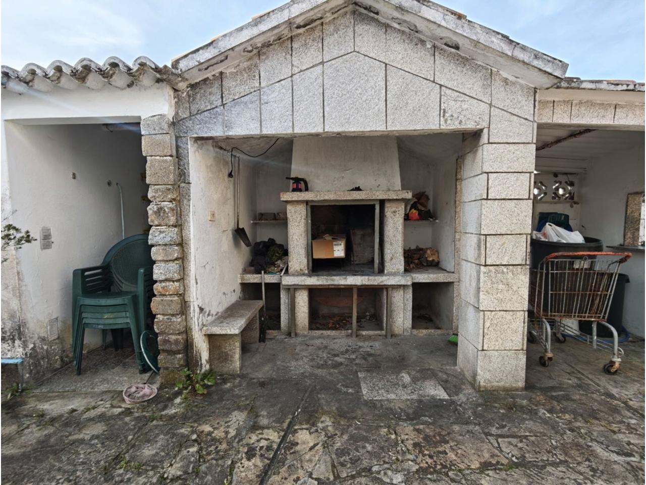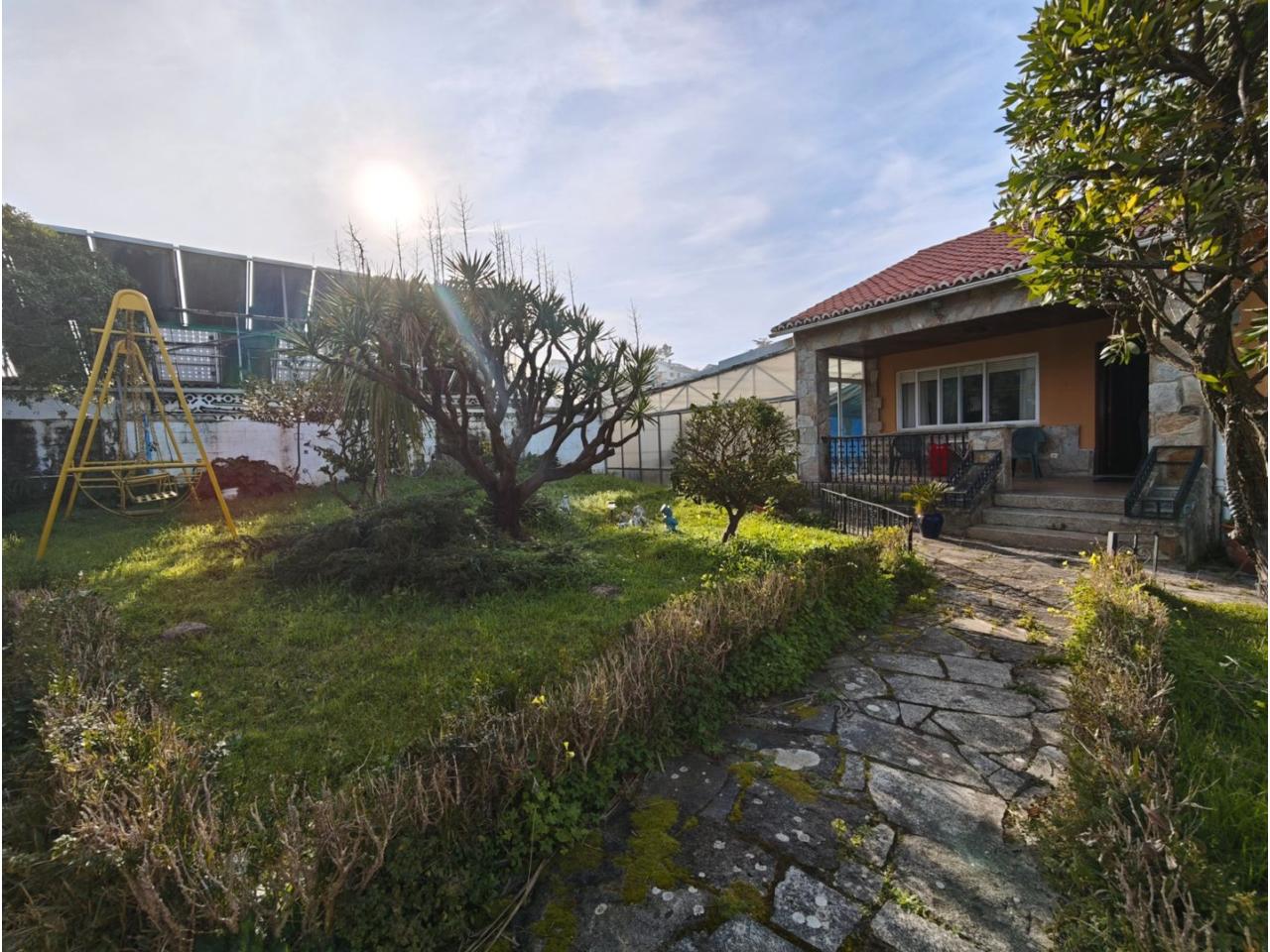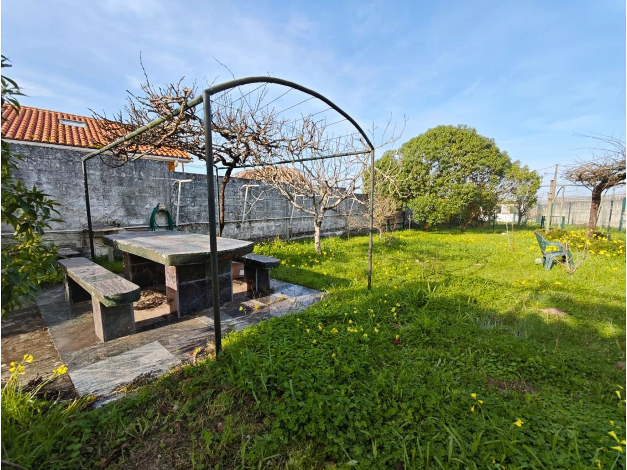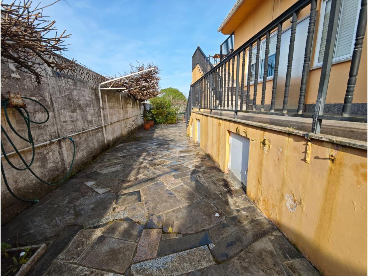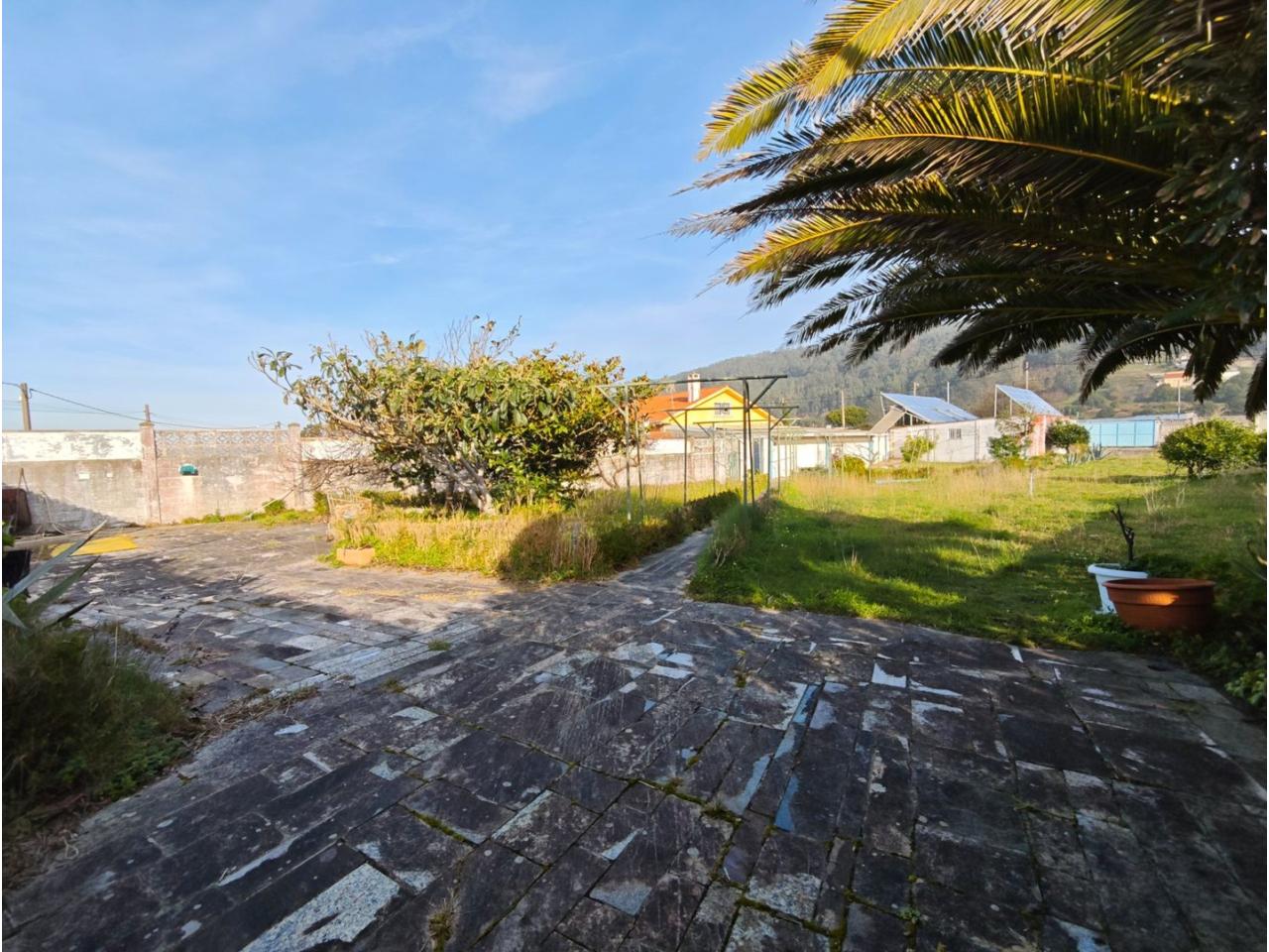 Ref. 341. - Tan solo 400 m son los que separan este chalet de la playa de S. Jorge, una de las playas más exitosas para deportes acuáticos de la comarca. La casa se sitúa sobre dos parcelas haciendo un total de casi 2800 m² de jardín. La casa se distribuye de la siguiente manera: un poche nos da la bienvenida accediendo a la vivienda donde en planta baja tenemos un salón con chimenea, cocina, despensa, baño general con ducha, y tres dormitorios dobles de los cuales el principal en suite con baño con bañera al cual accedemos directamente a través del dormitorio o a través del pasillo. Toda la planta tiene doble ventanal. Saliendo, accedemos a través de unas escaleras a la planta alta, independiente, en donde tenemos una zona de terraza descubierta, zona de terraza cubierta y en el interior cocina americana con comedor, baño, y un buen dormitorio ó salón dependiendo de las necesidades (en la foto sería la zona de sofás) y una habitación interior, perfecta para un dormitorio auxiliar o almacenaje. En el exterior, disfrutaremos de nuestras tardes de verano de una mesa y bancos rodeados de árboles.. . y dos galpones para las gallinas, perros. etc. Por supuesto la piscina cubierta y climatizada a través de las placas térmicas instaladas en el jardín junto con las placas solares (las placas térmicas necesitan arreglos). La piscina cubierta se puede descubrir para disfrutar de los días estivales (necesita arreglos). Por último, el taller equipado con maquinaria en donde están las baterías de las placas. La finca está totalmente cerrada y tiene entrada por dos calles. Calefacción gasoil. Riego automático. MILCASAS Galicia.