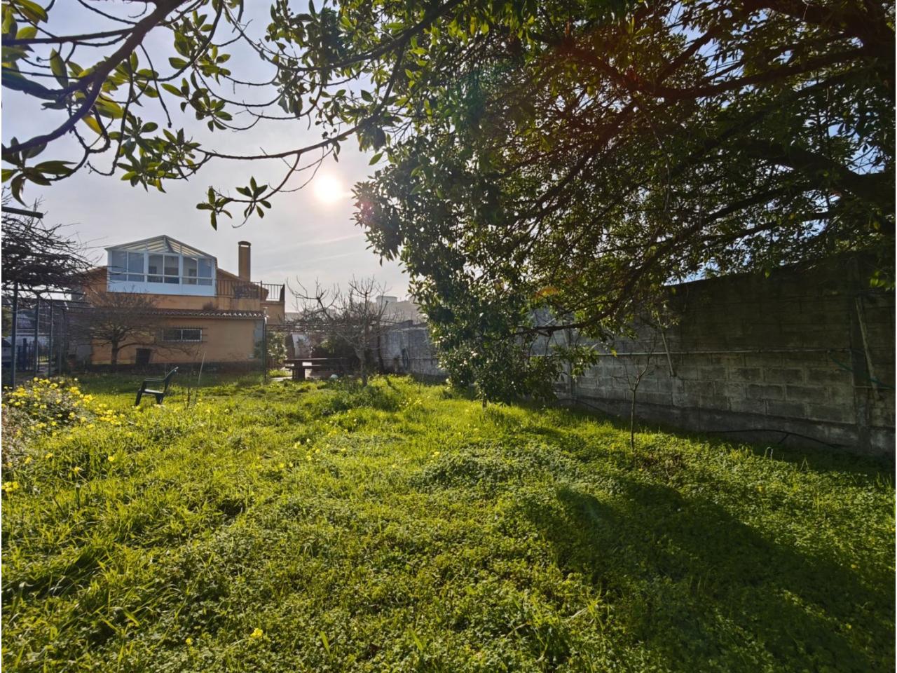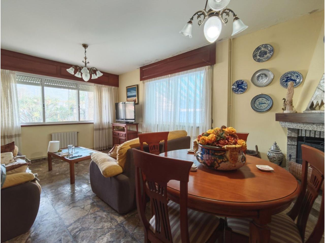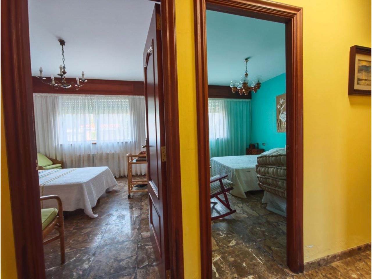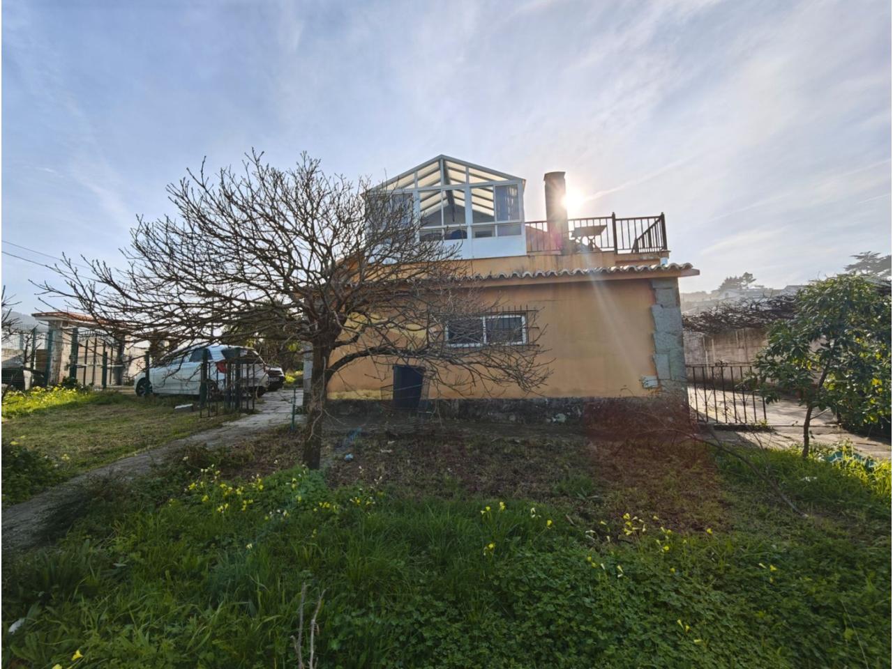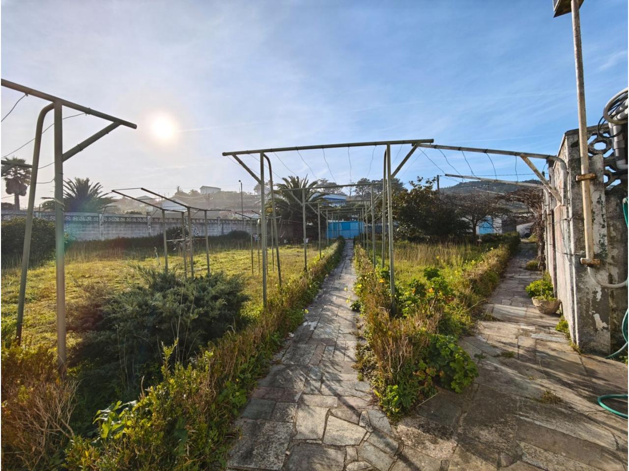 Ref. 341. - Tan solo 400 m son los que separan este chalet de la playa de S. Jorge, una de las playas más exitosas para deportes acuáticos de la comarca. La casa se sitúa sobre dos parcelas haciendo un total de casi 2800 m² de jardín. La casa se distribuye de la siguiente manera: un poche nos da la bienvenida accediendo a la vivienda donde en planta baja tenemos un salón con chimenea, cocina, despensa, baño general con ducha, y tres dormitorios dobles de los cuales el principal en suite con baño con bañera al cual accedemos directamente a través del dormitorio o a través del pasillo. Toda la planta tiene doble ventanal. Saliendo, accedemos a través de unas escaleras a la planta alta, independiente, en donde tenemos una zona de terraza descubierta, zona de terraza cubierta y en el interior cocina americana con comedor, baño, y un buen dormitorio ó salón dependiendo de las necesidades (en la foto sería la zona de sofás) y una habitación interior, perfecta para un dormitorio auxiliar o almacenaje. En el exterior, disfrutaremos de nuestras tardes de verano de una mesa y bancos rodeados de árboles.. . y dos galpones para las gallinas, perros. etc. Por supuesto la piscina cubierta y climatizada a través de las placas térmicas instaladas en el jardín junto con las placas solares (las placas térmicas necesitan arreglos). La piscina cubierta se puede descubrir para disfrutar de los días estivales (necesita arreglos). Por último, el taller equipado con maquinaria en donde están las baterías de las placas. La finca está totalmente cerrada y tiene entrada por dos calles. Calefacción gasoil. Riego automático. MILCASAS Galicia.