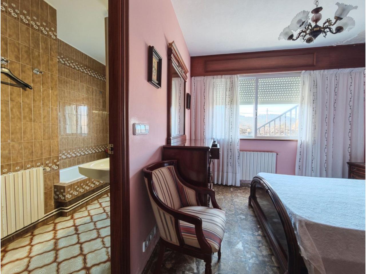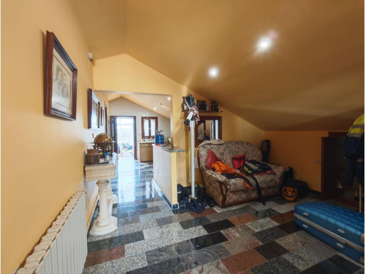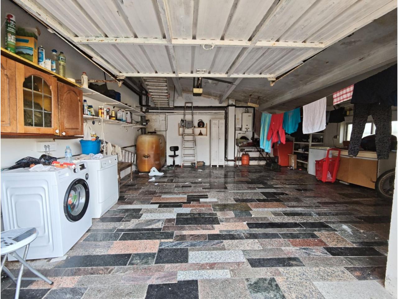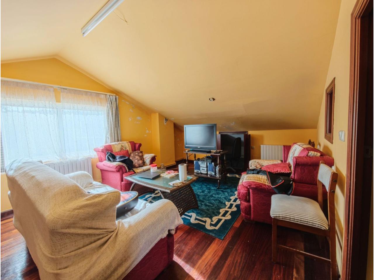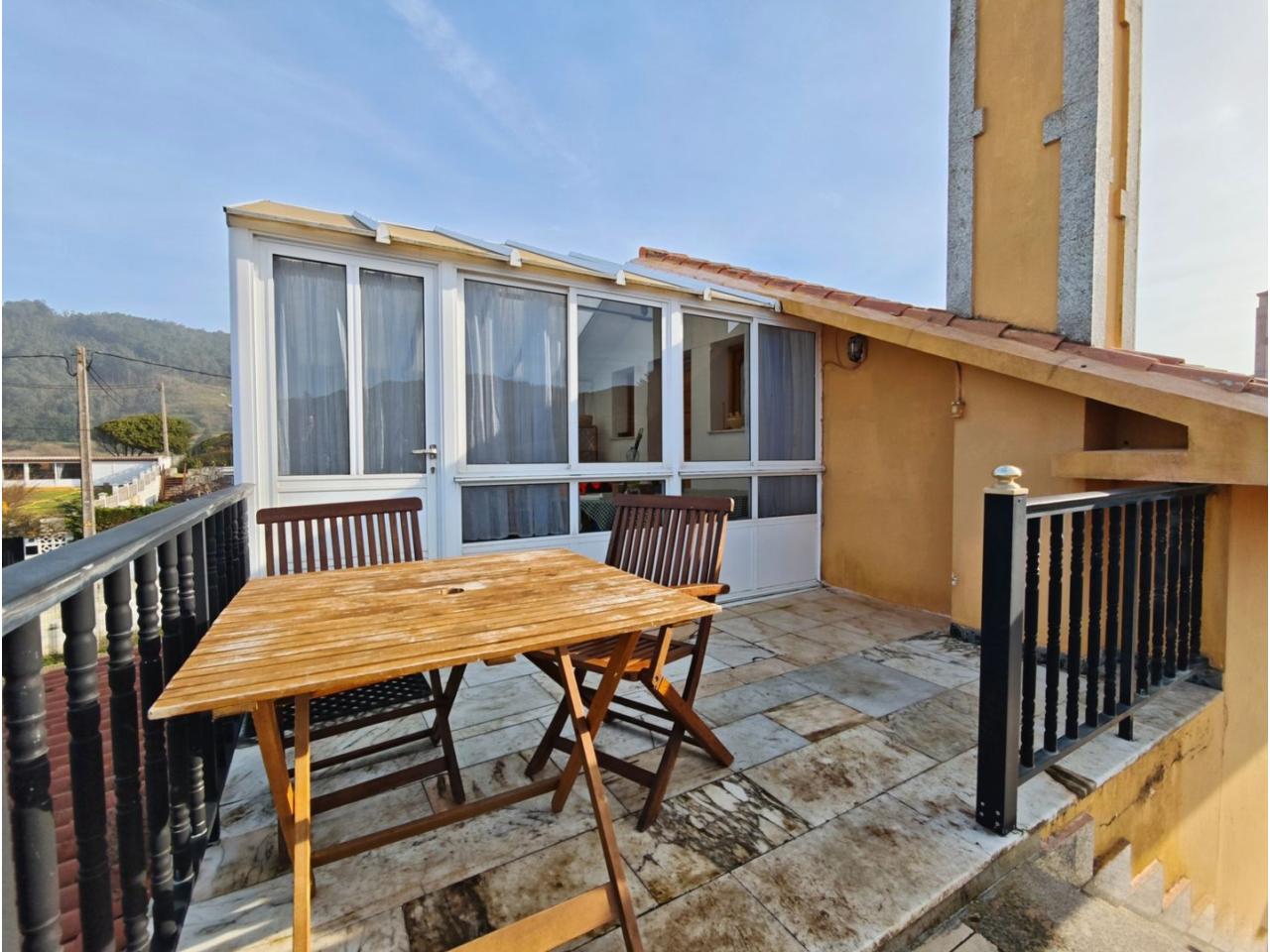 Ref. 341. - Tan solo 400 m son los que separan este chalet de la playa de S. Jorge, una de las playas más exitosas para deportes acuáticos de la comarca. La casa se sitúa sobre dos parcelas haciendo un total de casi 2800 m² de jardín. La casa se distribuye de la siguiente manera: un poche nos da la bienvenida accediendo a la vivienda donde en planta baja tenemos un salón con chimenea, cocina, despensa, baño general con ducha, y tres dormitorios dobles de los cuales el principal en suite con baño con bañera al cual accedemos directamente a través del dormitorio o a través del pasillo. Toda la planta tiene doble ventanal. Saliendo, accedemos a través de unas escaleras a la planta alta, independiente, en donde tenemos una zona de terraza descubierta, zona de terraza cubierta y en el interior cocina americana con comedor, baño, y un buen dormitorio ó salón dependiendo de las necesidades (en la foto sería la zona de sofás) y una habitación interior, perfecta para un dormitorio auxiliar o almacenaje. En el exterior, disfrutaremos de nuestras tardes de verano de una mesa y bancos rodeados de árboles.. . y dos galpones para las gallinas, perros. etc. Por supuesto la piscina cubierta y climatizada a través de las placas térmicas instaladas en el jardín junto con las placas solares (las placas térmicas necesitan arreglos). La piscina cubierta se puede descubrir para disfrutar de los días estivales (necesita arreglos). Por último, el taller equipado con maquinaria en donde están las baterías de las placas. La finca está totalmente cerrada y tiene entrada por dos calles. Calefacción gasoil. Riego automático. MILCASAS Galicia.