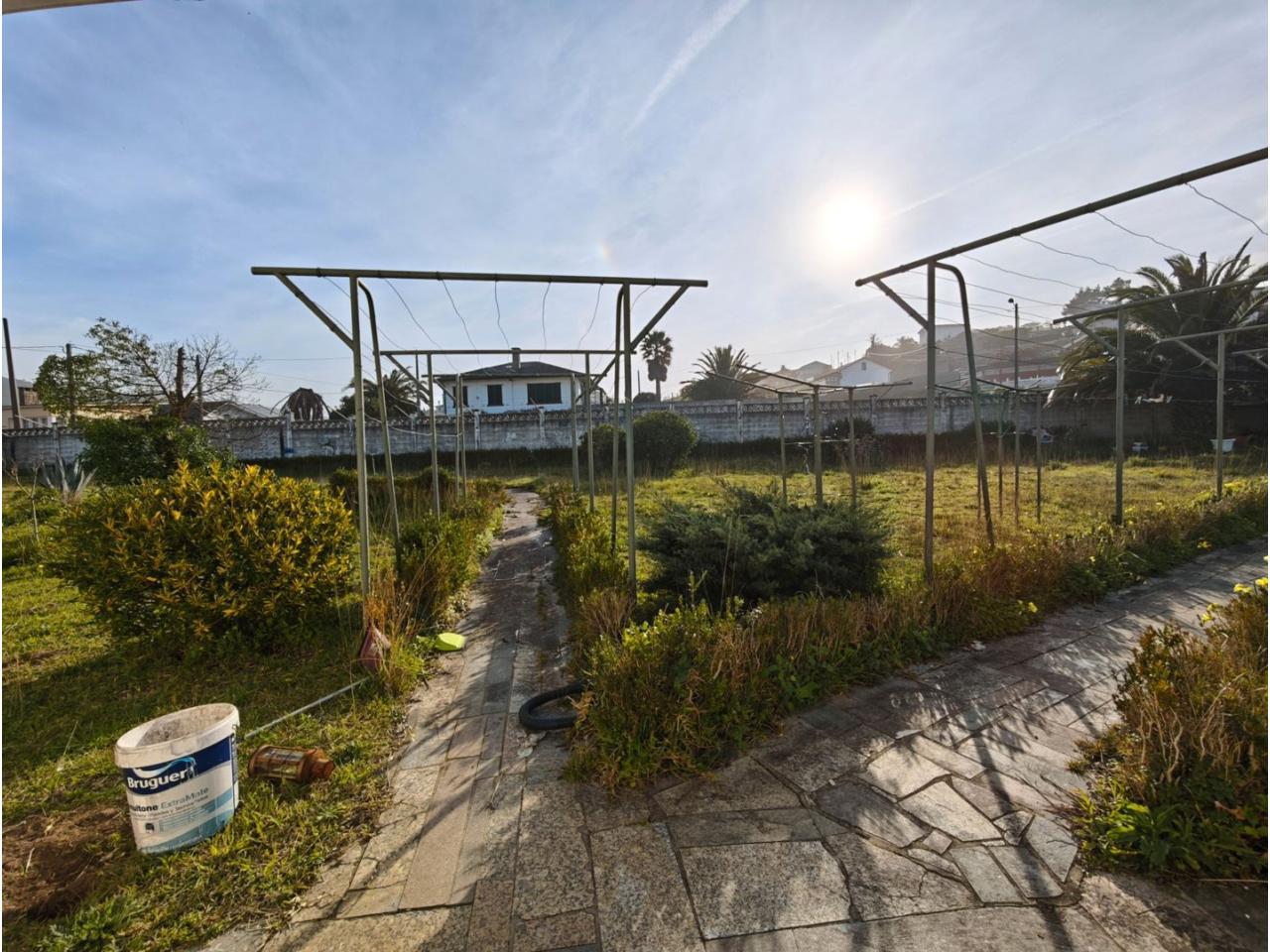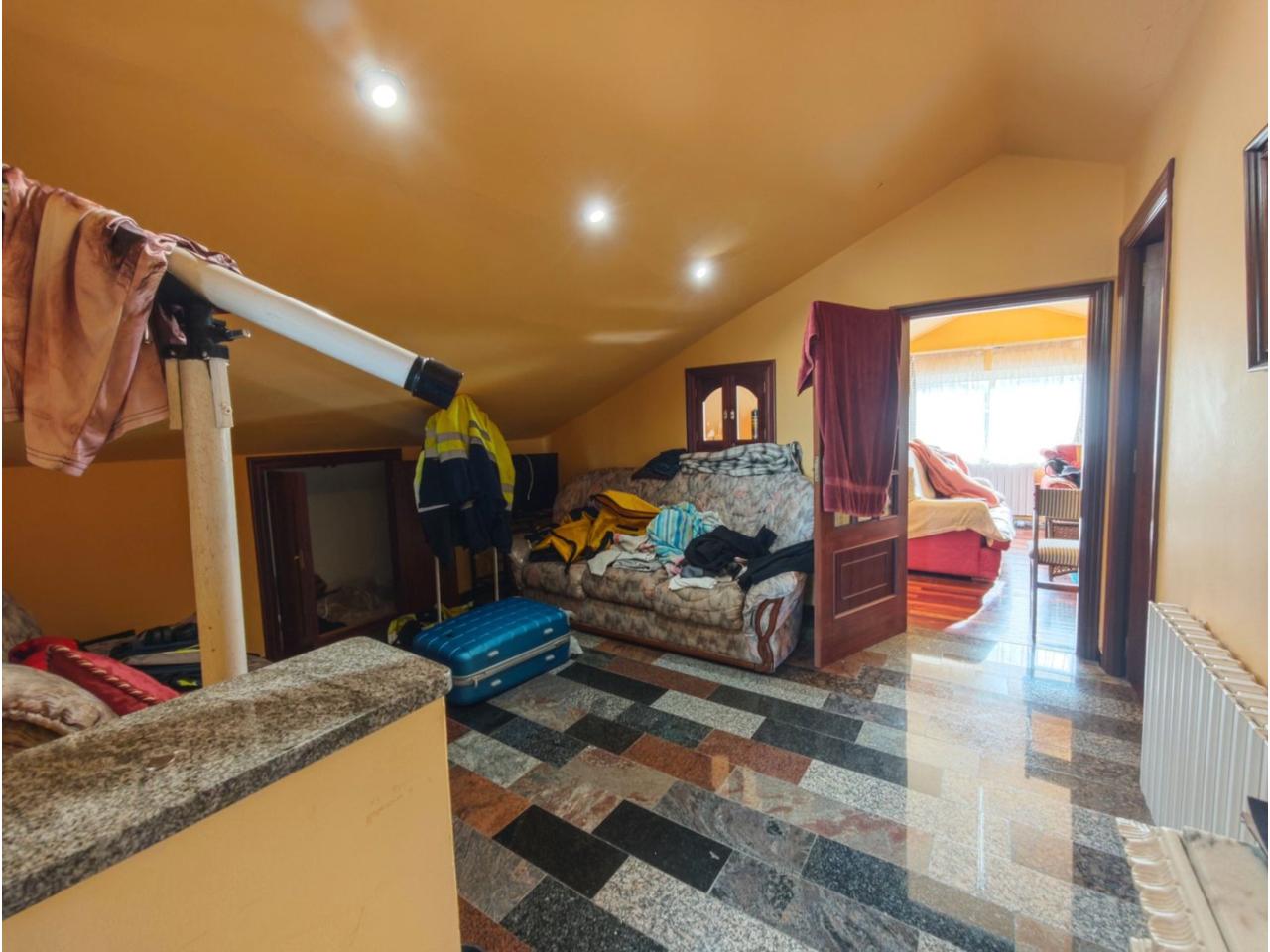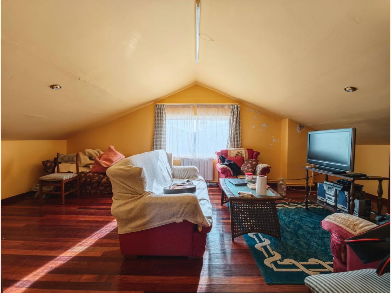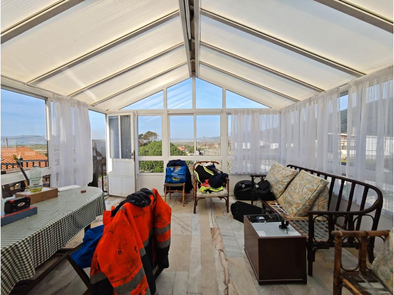 Ref. 341. - Tan solo 400 m son los que separan este chalet de la playa de S. Jorge, una de las playas más exitosas para deportes acuáticos de la comarca. La casa se sitúa sobre dos parcelas haciendo un total de casi 2800 m² de jardín. La casa se distribuye de la siguiente manera: un poche nos da la bienvenida accediendo a la vivienda donde en planta baja tenemos un salón con chimenea, cocina, despensa, baño general con ducha, y tres dormitorios dobles de los cuales el principal en suite con baño con bañera al cual accedemos directamente a través del dormitorio o a través del pasillo. Toda la planta tiene doble ventanal. Saliendo, accedemos a través de unas escaleras a la planta alta, independiente, en donde tenemos una zona de terraza descubierta, zona de terraza cubierta y en el interior cocina americana con comedor, baño, y un buen dormitorio ó salón dependiendo de las necesidades (en la foto sería la zona de sofás) y una habitación interior, perfecta para un dormitorio auxiliar o almacenaje. En el exterior, disfrutaremos de nuestras tardes de verano de una mesa y bancos rodeados de árboles.. . y dos galpones para las gallinas, perros. etc. Por supuesto la piscina cubierta y climatizada a través de las placas térmicas instaladas en el jardín junto con las placas solares (las placas térmicas necesitan arreglos). La piscina cubierta se puede descubrir para disfrutar de los días estivales (necesita arreglos). Por último, el taller equipado con maquinaria en donde están las baterías de las placas. La finca está totalmente cerrada y tiene entrada por dos calles. Calefacción gasoil. Riego automático. MILCASAS Galicia.